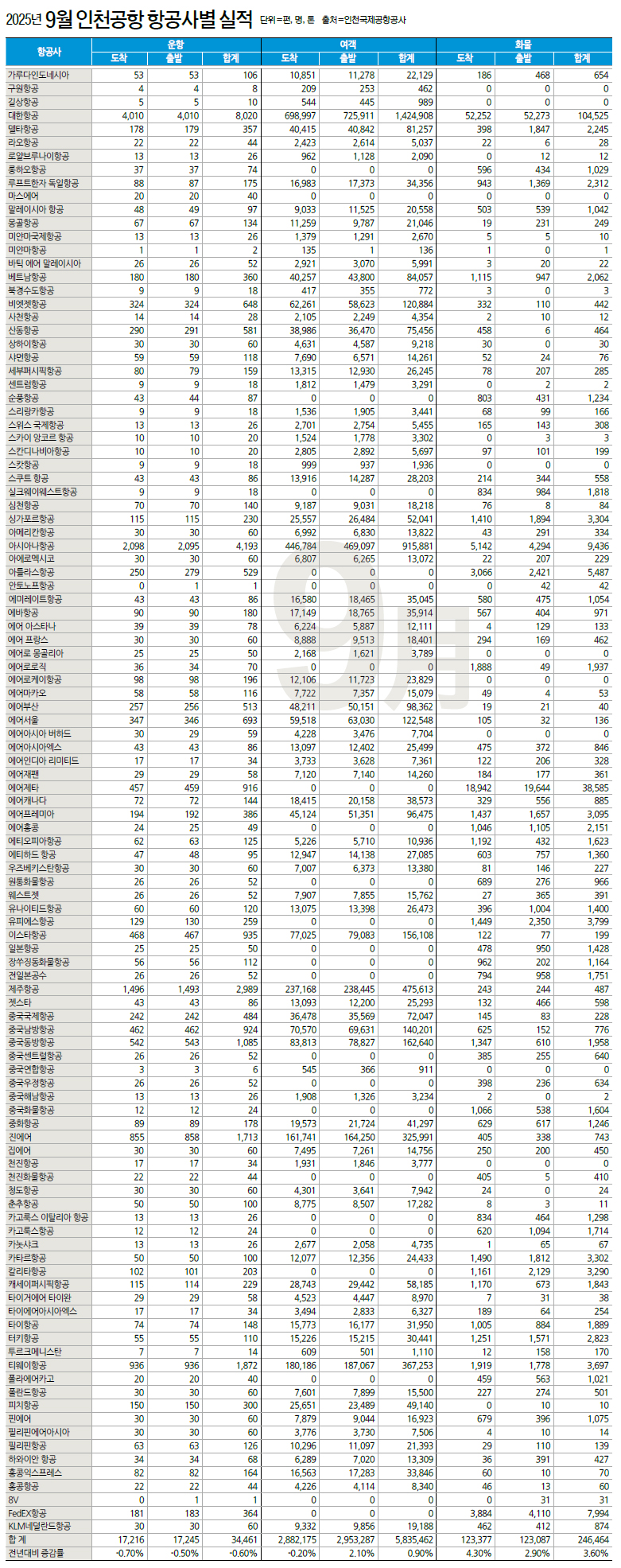 [항공통계] 2025년 9월 인천공항 항공사별 실적